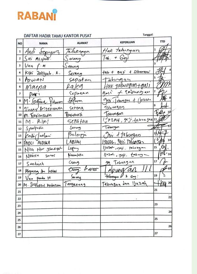 Pada media info fakta news mengatakan, ia bersama 20 orang ex pegawai Rabani mendatangi kantor pusat karena sudah berjalan lama belum juga ada penyelesaian.