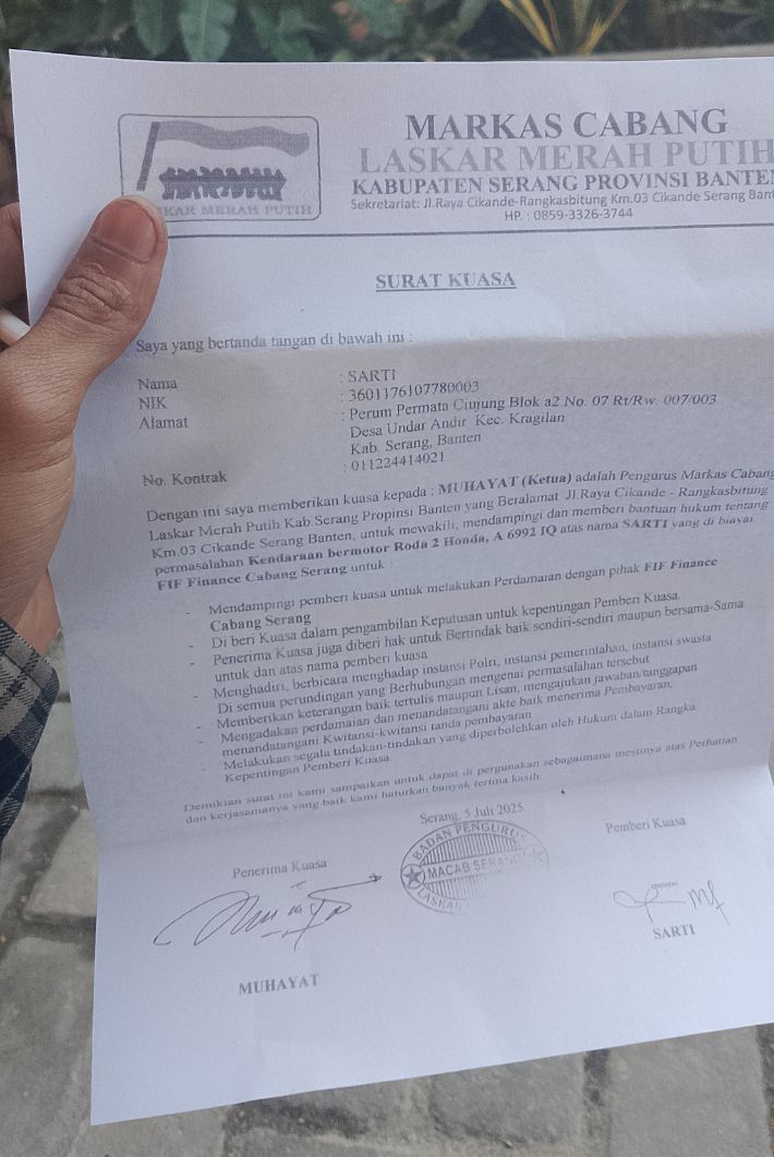 Dan menanyakan tentang surat kuasa yang dikirim Laskar Merah Putih Markas Cabang Serang dan dalam surat tersebut menyatakan unit yang menunggak tersebut di beck up dirinya dengan memakai ormas.