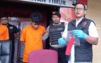BINTAN TIMUR - info fakta news Kanit Reskrim Polsek Bintan Timur Ipda Daeng Salamun menunjukkan barang bukti sebilah pisau yang digunakan pelaku US alias U (20) untuk menusuk korban, saat konferensi pers di Mapolsek . . .